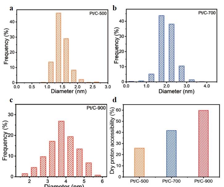 圖2. Pt/C-500、Pt/C-700、Pt/C-900的Pt顆粒尺寸與干質(zhì)子可及率。(Sci. China Mater. 2024, 67, 1851-1857)